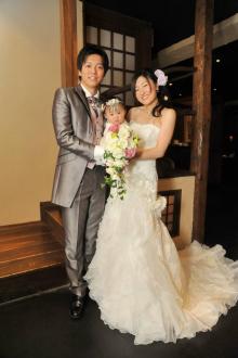 マーメイドラインの素敵なドレス姿のママと、かっこいいロングタキシード姿の